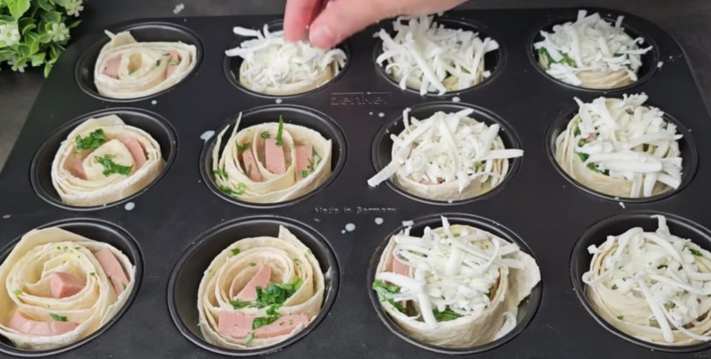 Вземете форма за печене на мъфини и намажете гнезда с масло. Подредете тортилите една върху друга и навийте на руло. С нож нарежете на парчета, с височина от около 3-4 сантиметра. Сложете всяко в гнездо и с пръсти леко разтворете. Нарежете колбаса и подредете при тортилата.