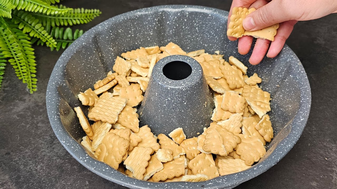 Вземете форма за печене на кекс и намажете с малко разтопено масло. Така ще извадите готовия десерт по –лесно. Начупете биксвититие и ги сложете в съда.