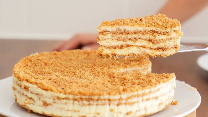 Отделете 4 супени лъжици за украса на тортата. Разделете трохите на 4 части. Вземете форма за печене с диамтър от 20 сантиметра и покрийте с хартия. Сипете една част от трохите и загладете. Полейте с крем и редувайте, докато продуктите свършат. Завършете с трохи и декорирайте според вкуса си.