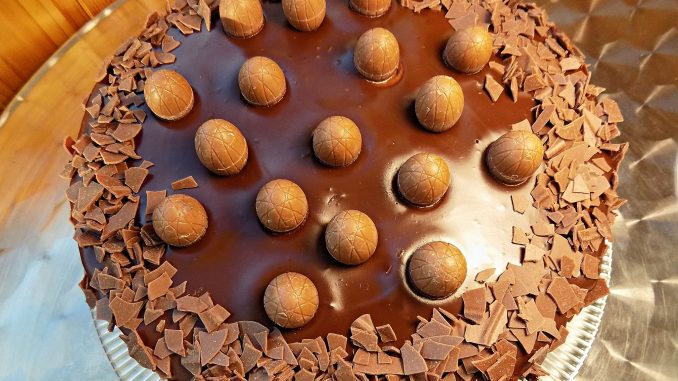 Вадя тортата от хладилника, премахвам фолиото и поливам с ганаша. Оставям в хладилника да стегне и след вадя. Украсявам, режа и сервирам.
