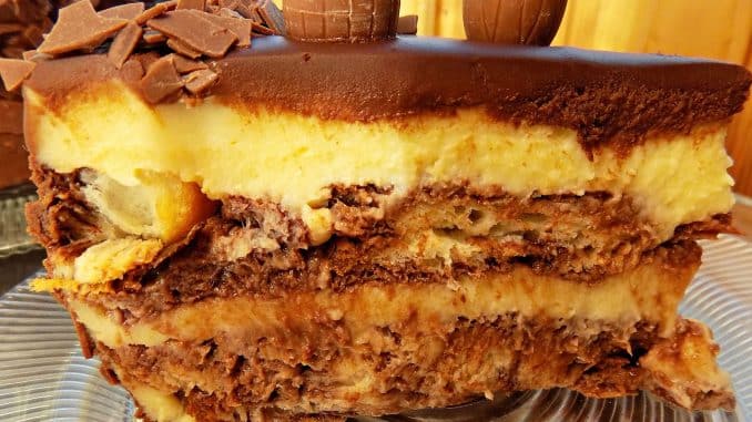Във форма за торта с подвижно дъно подреждам филийките козунак, потопени за кратко в подсладено прясно мляко, смесено предварително с 2-3 супени лъжици какао. Редувам козунак и крем до изчерпване на количествата, като завършвам с крем. Покривам тортата с фолио и слагам в хладилника да стегне за една нощ.
