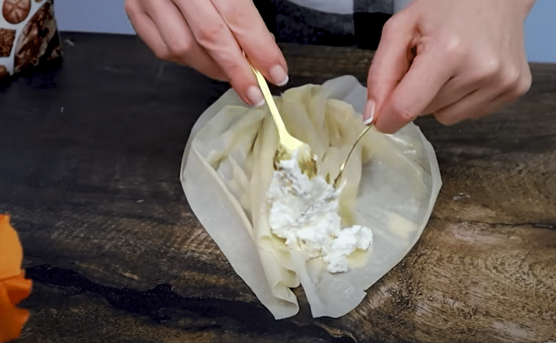 Вземете една кора за баница и намажете с пълнежа. След това сгънете два от срещуположните краища и с другата ръка долепете другите два края, така че да се оформи листо. В горния му край сложете малко от натрошеното сирене и навийте като сарма.