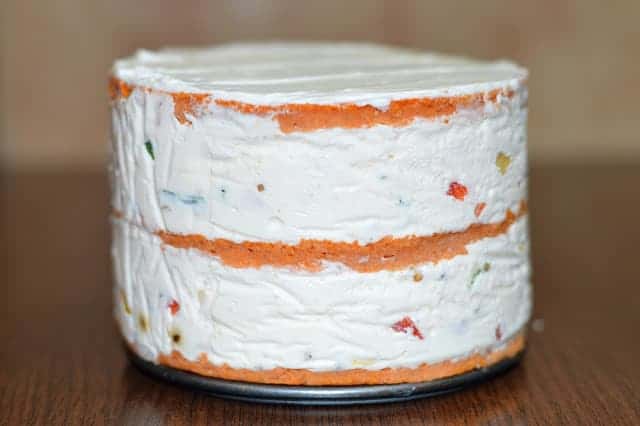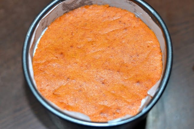 Пригответе крема, като в подходящ съд разбиете крем сиренето и заквасената сметана. Бийте, докато сместа стане еднородна. Разтворете желатина, според указанието на опаковката и оставете да се охлади за 3-4 минути. След това добавете към крема и разбъркайте. Отделете 3 супени лъжици от сместа.