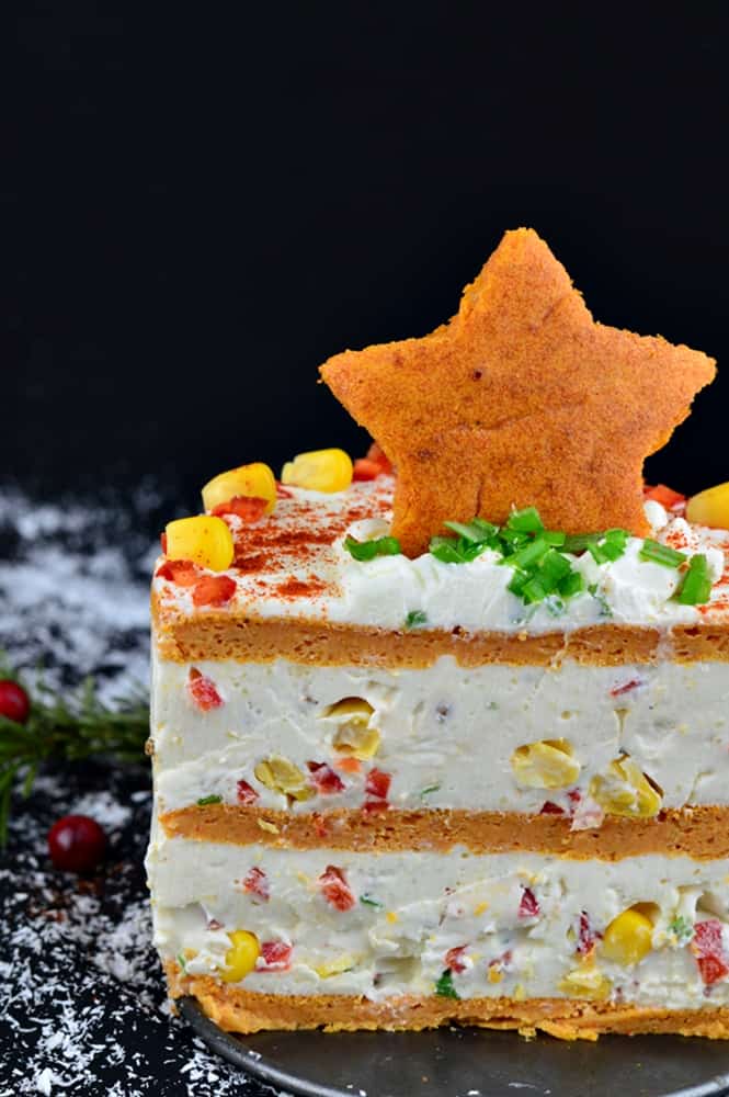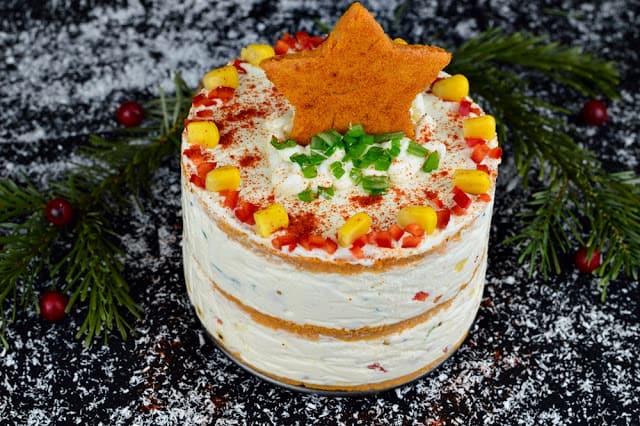 Завършете тортата като слепите три блата с крем. Работете с ринг. Премахнете пръстена и покрийте с останалия крем. Декорирайте със зрънца царевица, парчета чушка и част от останалия блат.