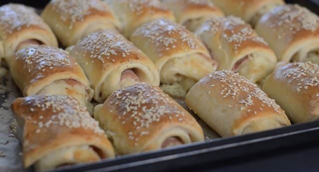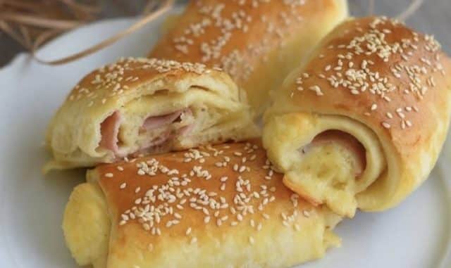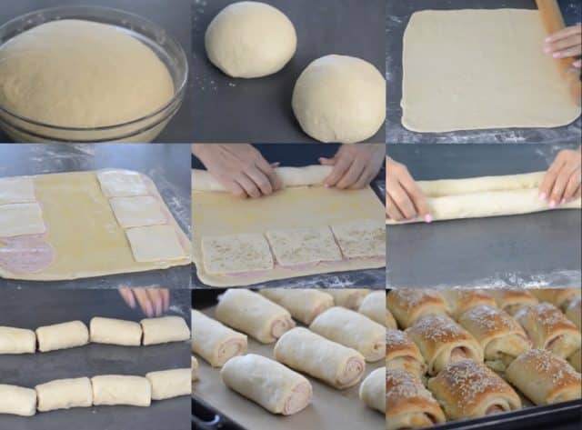 Вземете едната и разточете правоъгълна форма с размери приблизително 33 x 35 сантиметра. Намажете кората с разтопено масло. Подредете тънко нарязана шунка от двата дълги края и тънко нарязания кашкавал отгоре. Поръсете със сушен риган. Сгънете краищата от двете страни към средата, оформяйки две рула. Разрежете рулата едно от друго, след което всяко руло нарежете на четири равни парчета, като отстраните краищата. Така рулцата ще са равни.