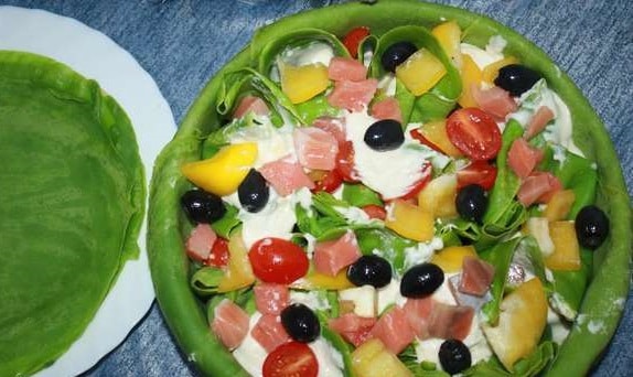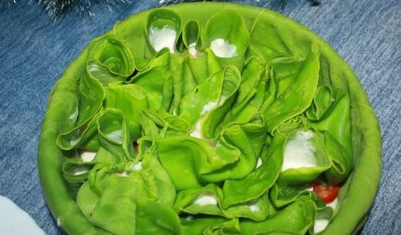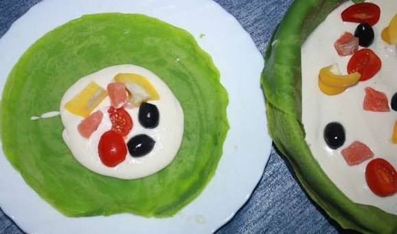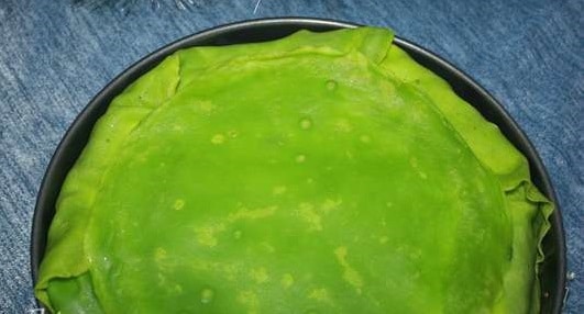 Загрейте тиган с незалепващо покритие и в него изпечете палачинките. Не печете твърде дълго, за да запазите красивия им зелен цвят. От посоченото количество се получават около 18 палачинки.