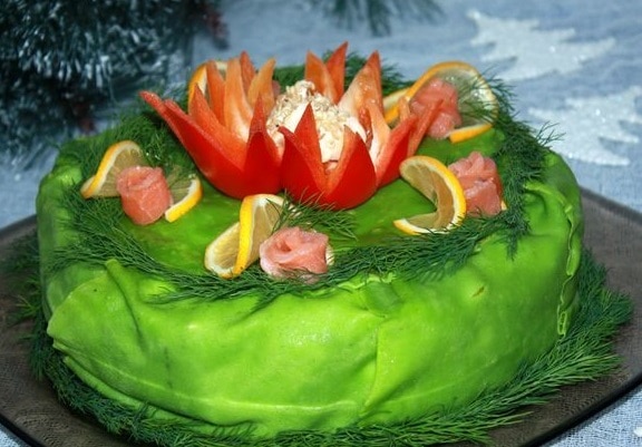Вземете форма за печене с подвижно дъно и я постелете с палачинки, като покриете плътно дъното и стените ѝ. Тези, които са по стените на съда, оставете да висят наполовина навън. Полейте с малко крем и поставете част от плънката. Вземете една палачинка. в средата ѝ сложете малко крем и плънка и след това свийте като сарма. Поставете я във формата и повторете с още 6-7 палачинки или докато се запълни съда. След като това стане, сипете малко от останалия крем, заравнете и поръсете с останалата плънка. Сипете последната част от крема и заравнете добре. Завийте с висящите краища и сложете последната палачинка.